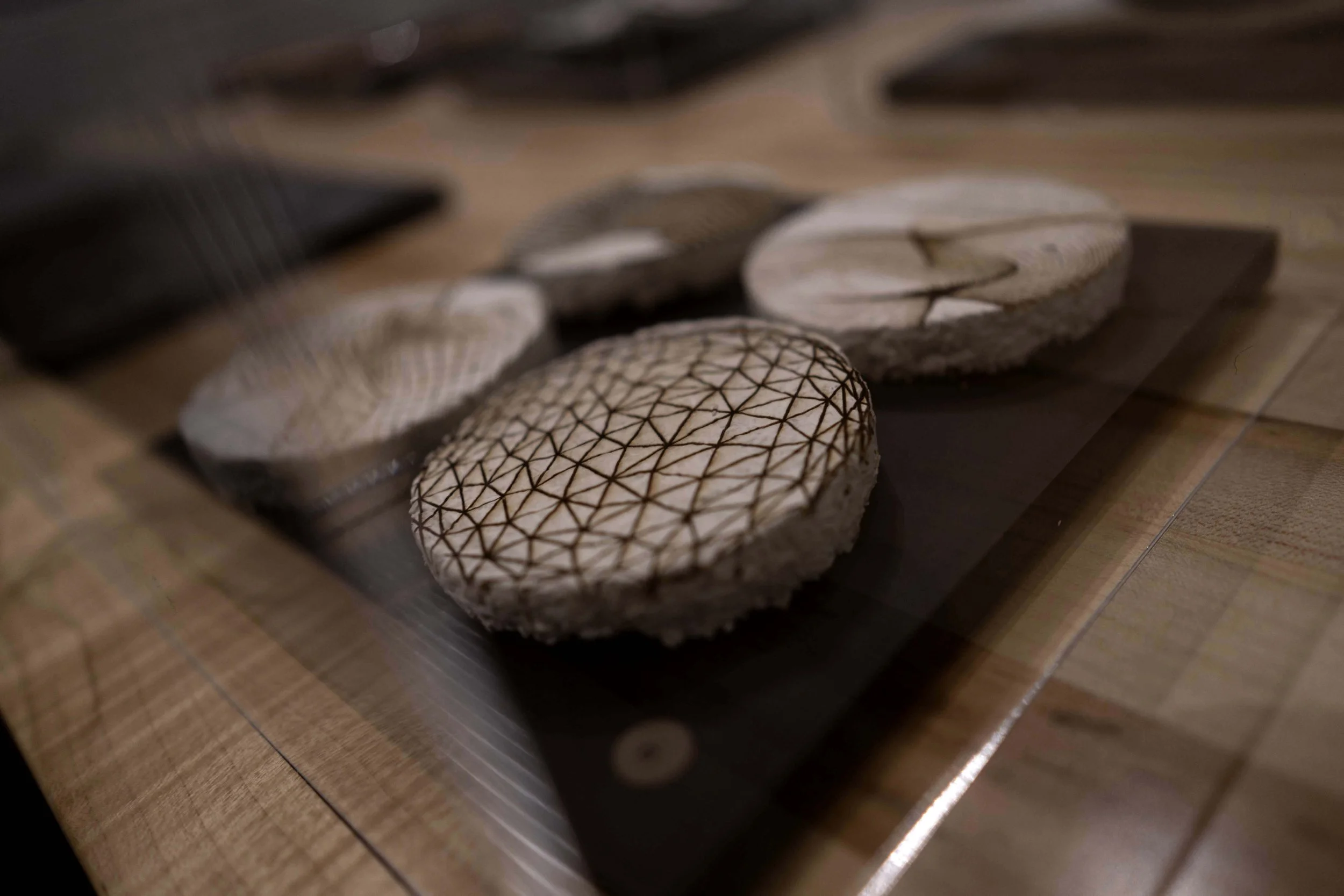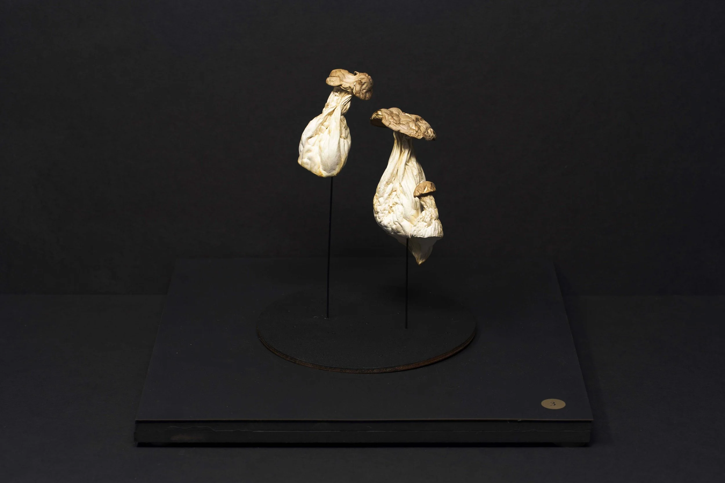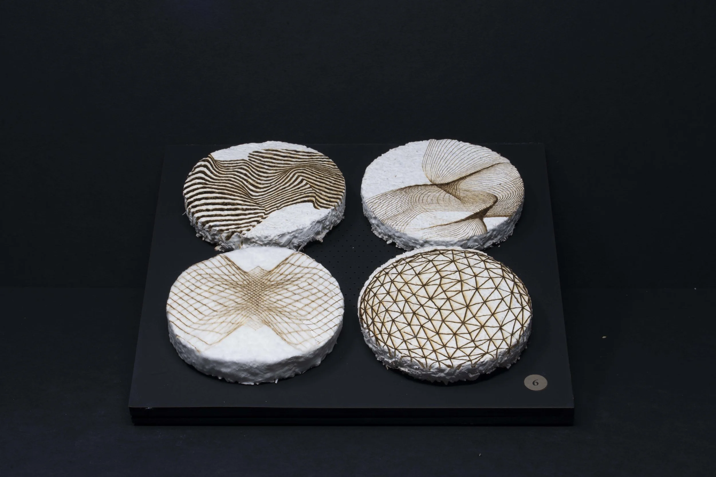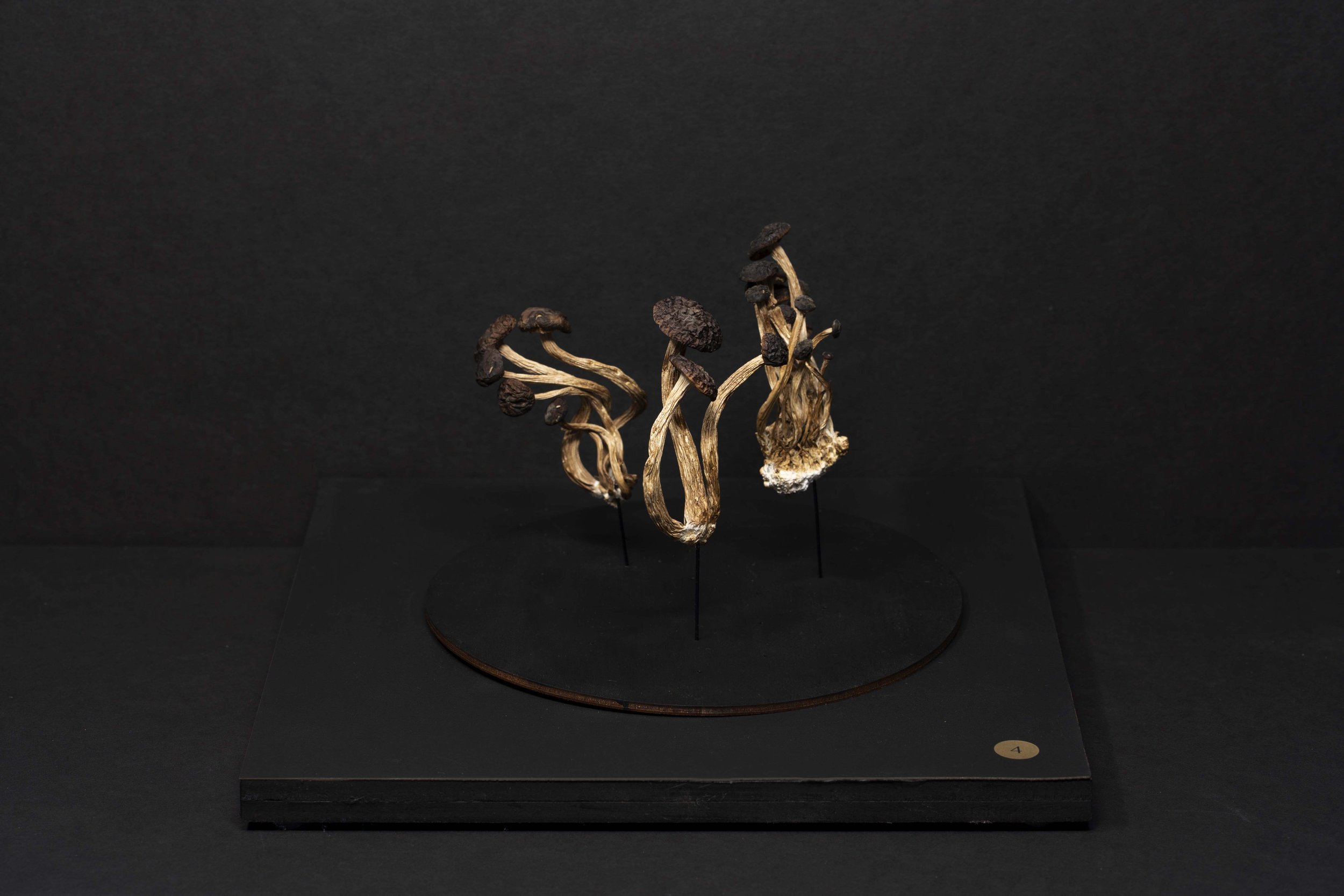 Each piece was grown by and with mycelium. This snow white and nearly microscopic organism fuses organic matter which can be casted in molds to produce sculptural shapes and textures. Color is obtained by aging the organism, through laser engraving, or by adding layers of bioplastic.