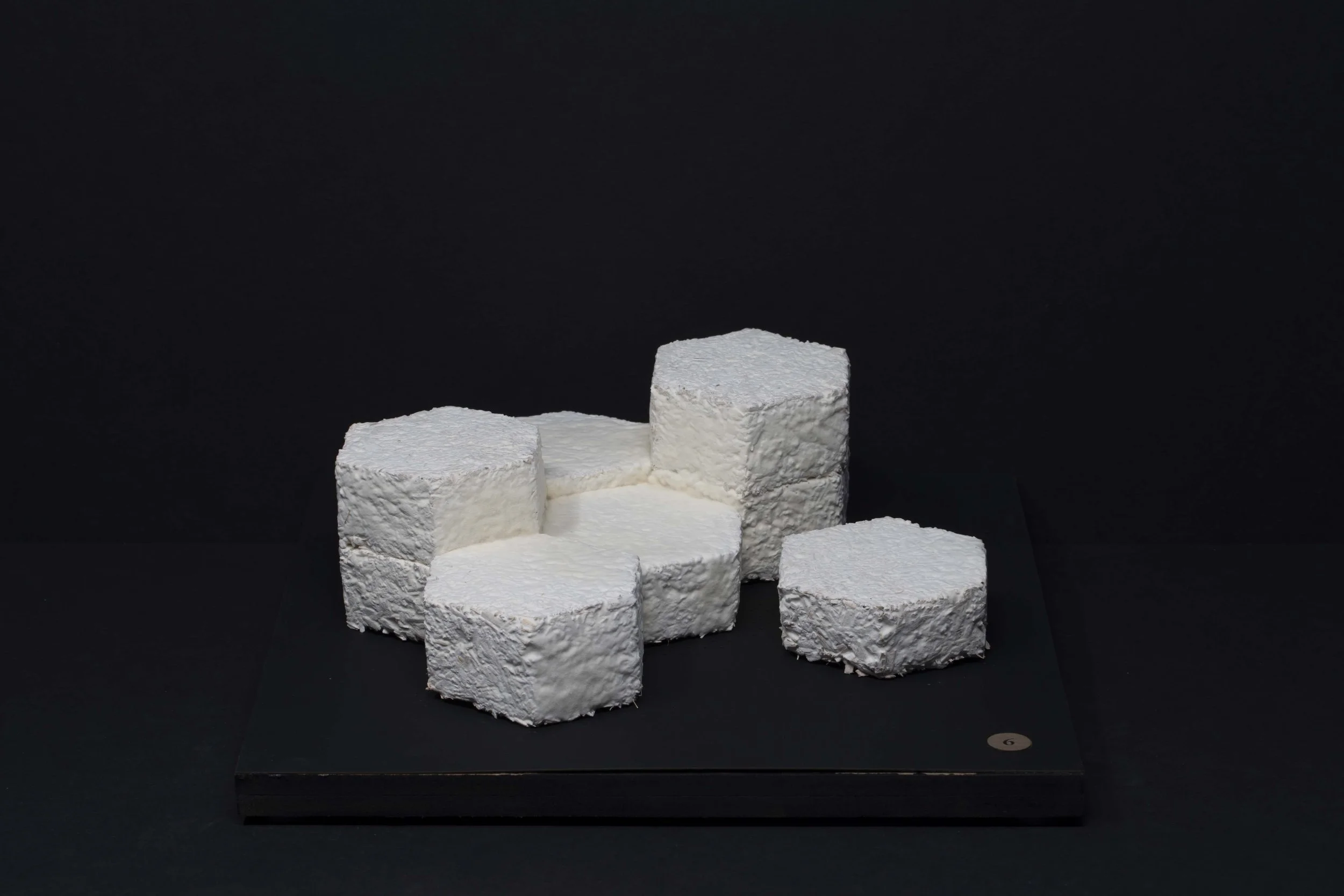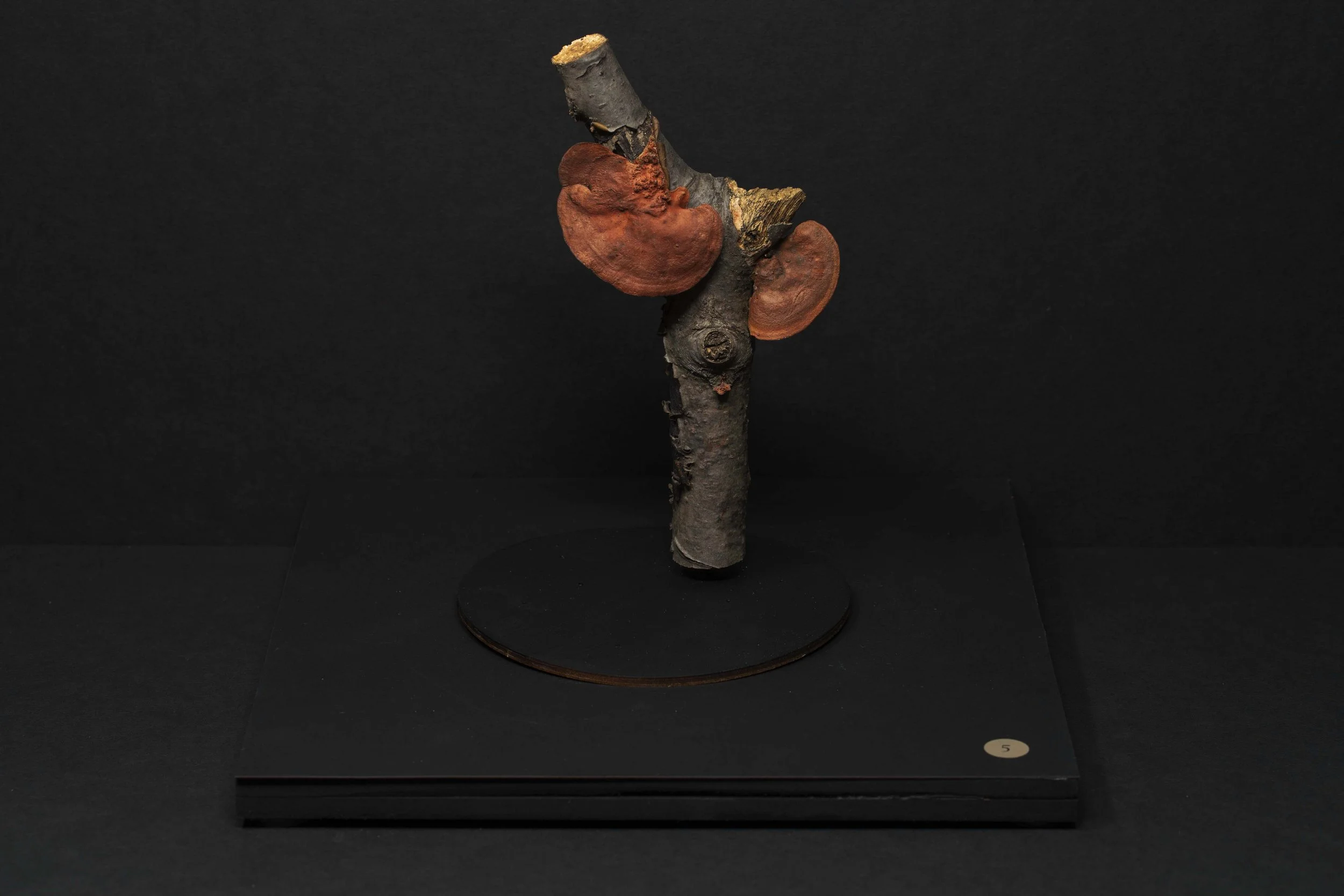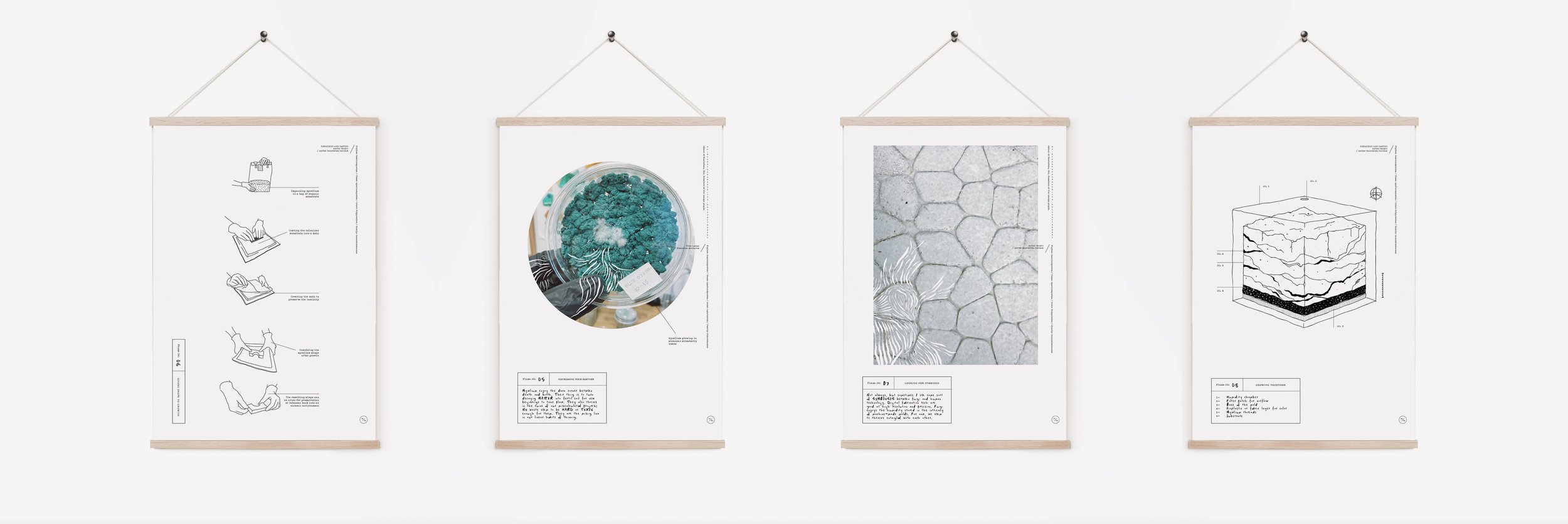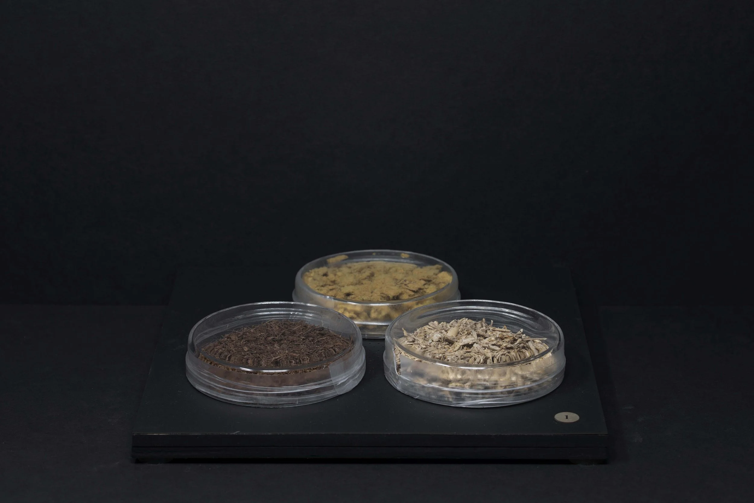 Each piece was grown by and with mycelium. This snow white and nearly microscopic organism fuses organic matter which can be casted in molds to produce sculptural shapes and textures. Color is obtained by aging the organism, through laser engraving, or by adding layers of bioplastic.