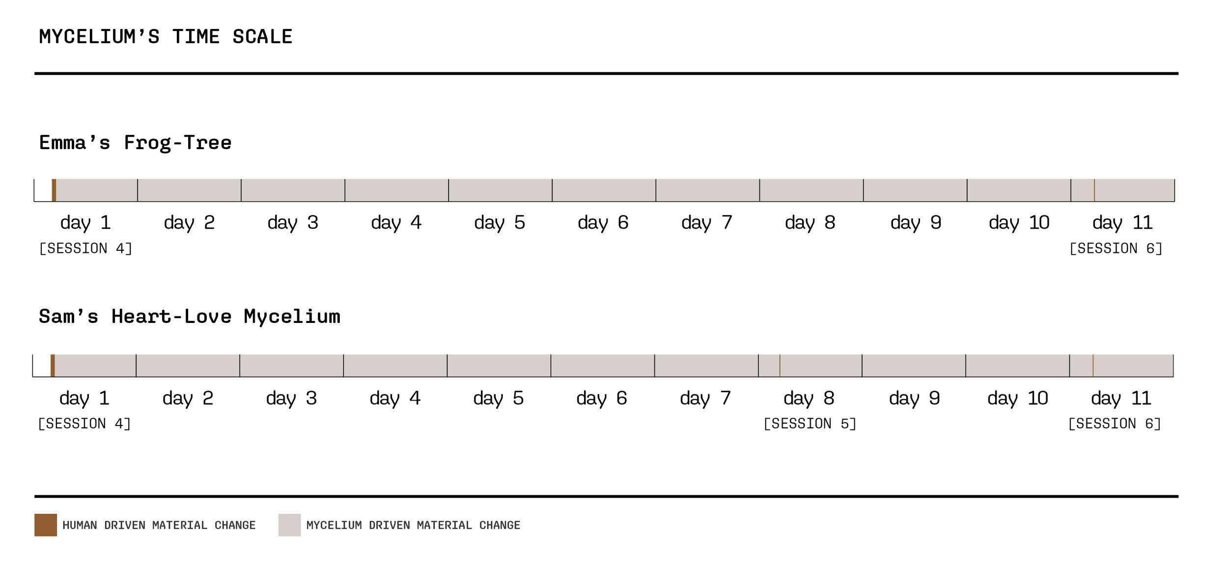 Time is the central organizing unit of the material flow diagram, and it is presented in two ways to contrast a human-centric conception of time and mycelium timeframe of development. The human-centric timeline was used for the larger diagrams (above). Making sessions are displayed in minute-long units, while the periods between sessions are condensed and displayed in day-long units. To better account for mycelium’s work between sessions, the mycelium-centric timeline is displayed below. This timeline uses day-long units and displays proportionally the amount of time in which mycelium was the leading actor driving material transformation (in light gray) versus in which human engagement was dominant (in brown).